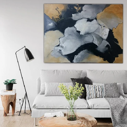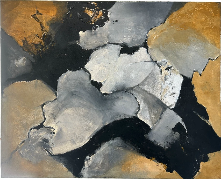 Esta pieza nació en un momento de conflicto interno profundo. No la planifiqué, no la forcé. Simplemente dejé que el pincel hablara por mí. Y apareció esto: formas orgánicas que se entrelazan, se enfrentan, dialogan. Grises que buscan equilibrio, negros que sostienen verdades difíciles, y ese oro que irrumpe como destellos de claridad.