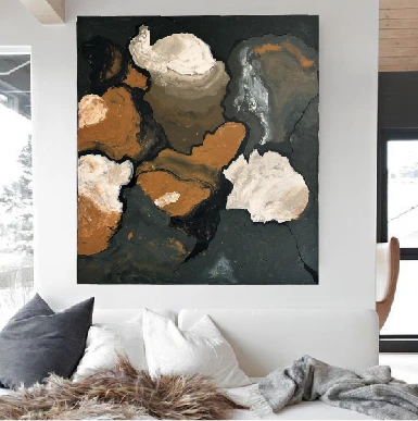 La materia se siente viva. Las transiciones entre los colores no son limpias: son veladuras, bordes que se derriten, grietas que sugieren fallas y relieves ocultos. Esa mezcla entre oscuridad y brillo cálido hace que la obra cambie con la luz del día: a veces más paisaje, a veces más magma, a veces pura abstracción.