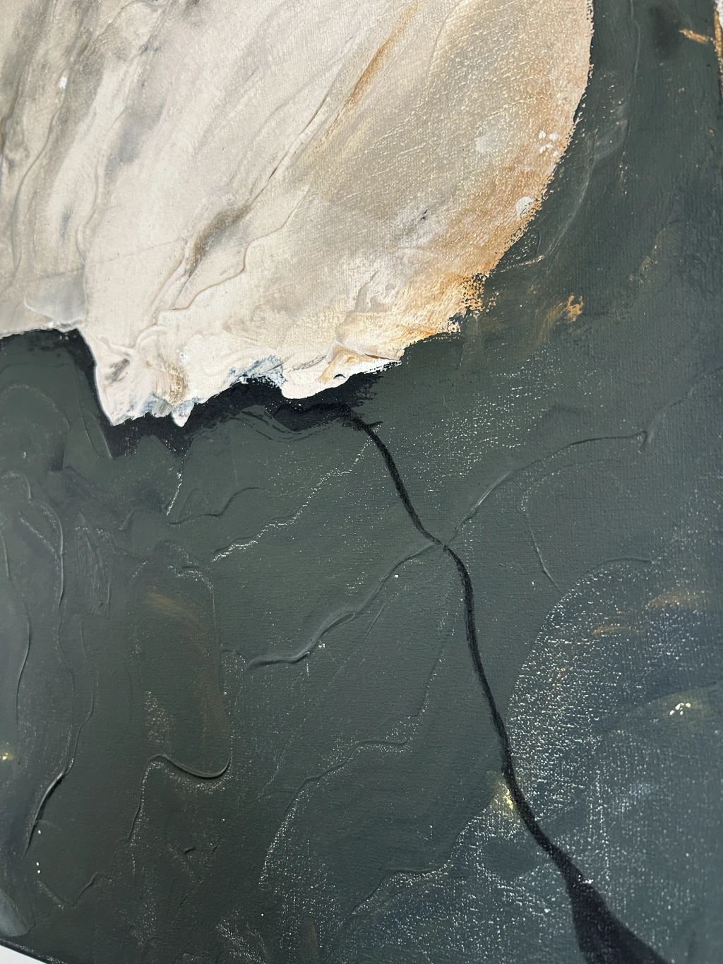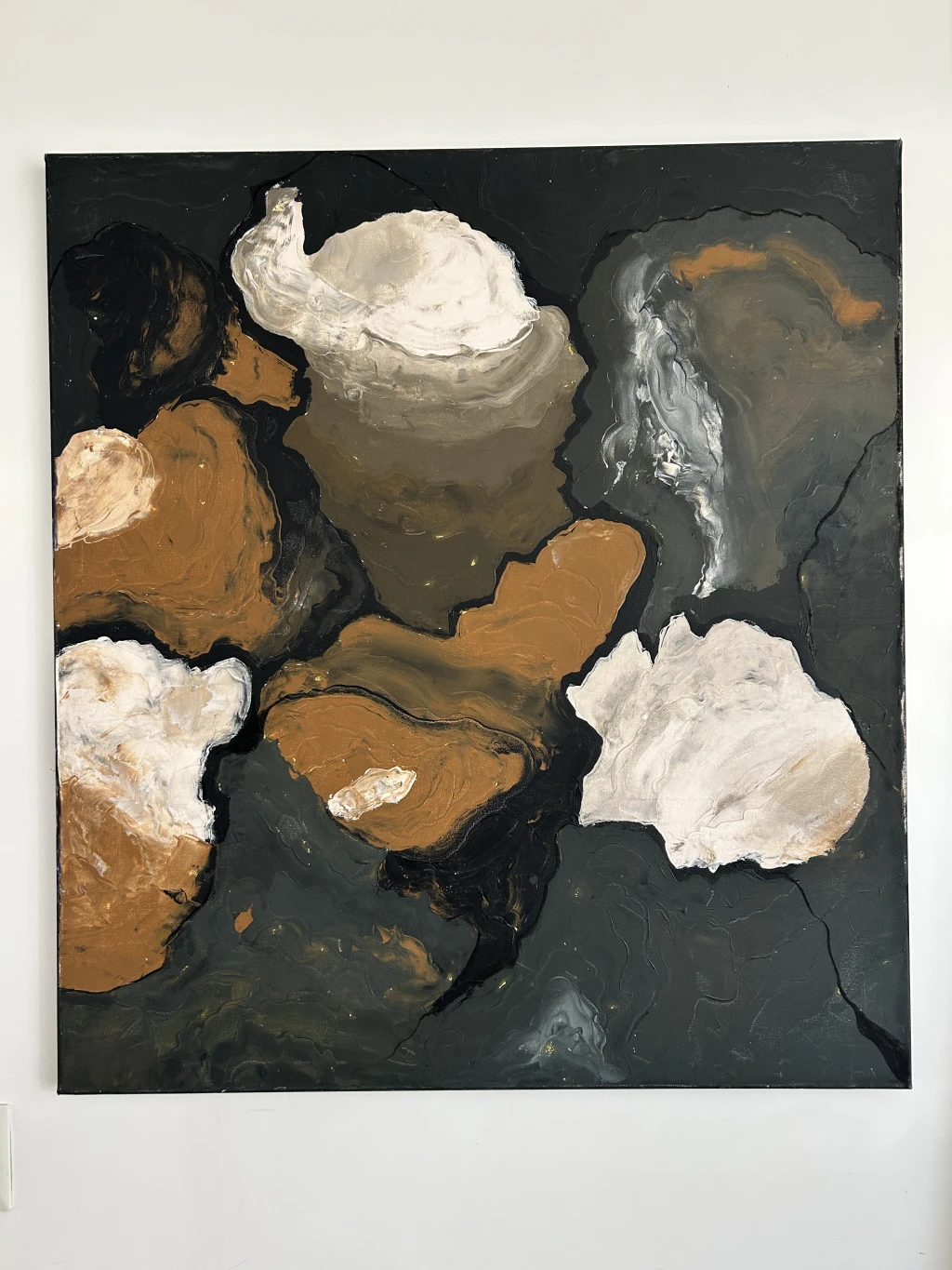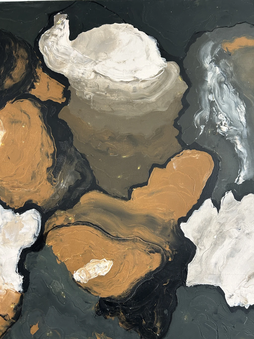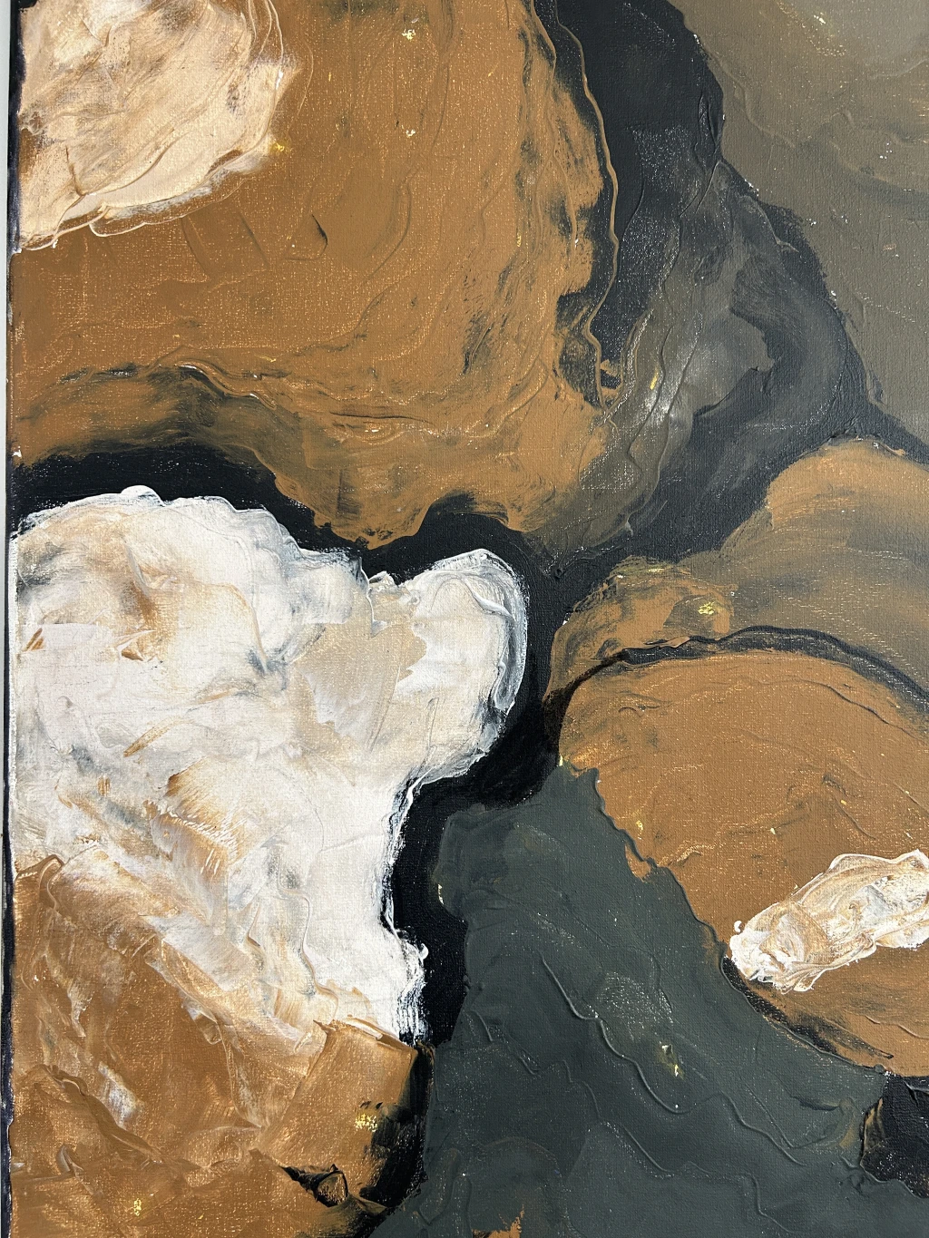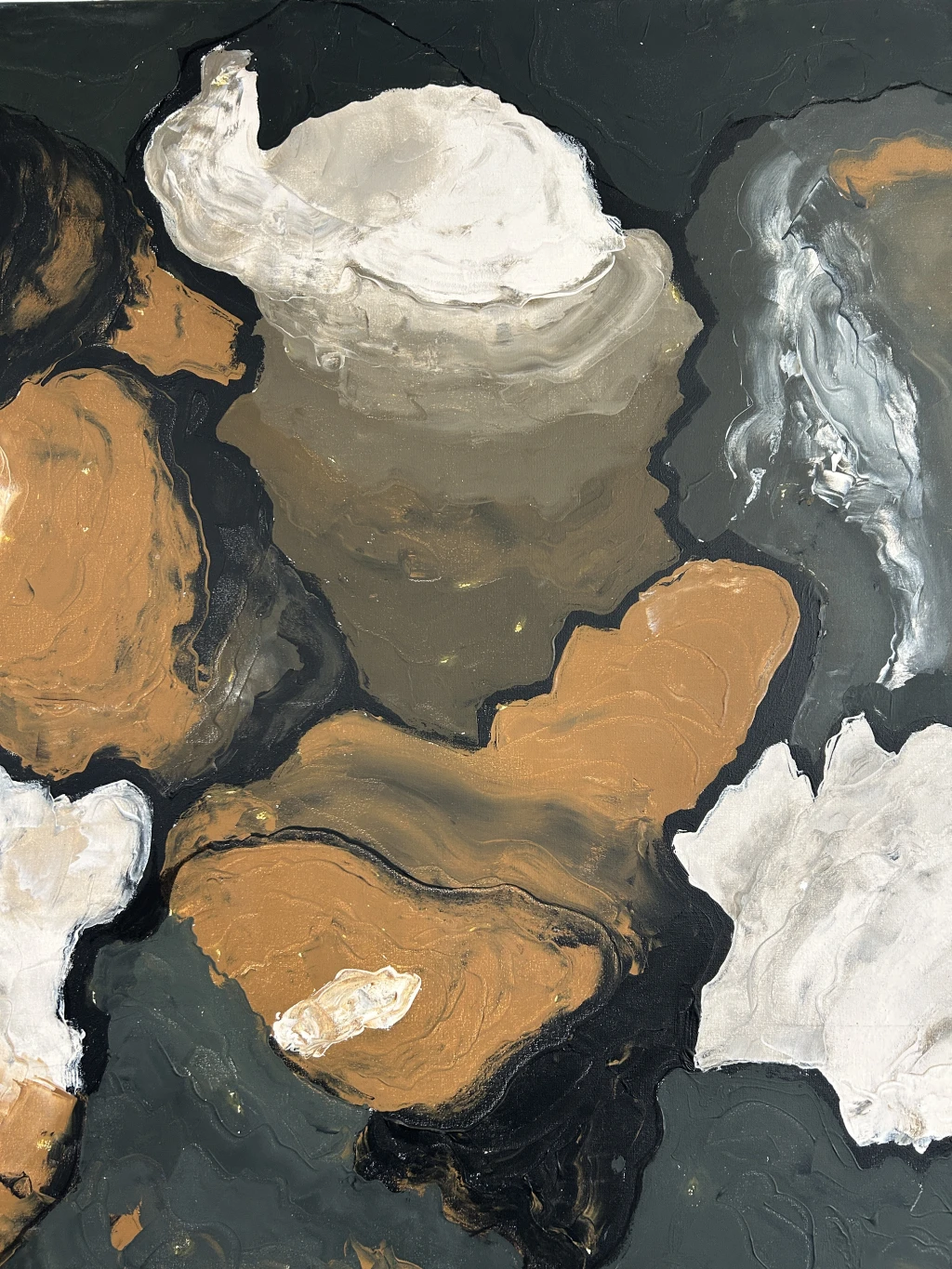 Las formas orgánicas en óxidos, dorados y blancos aparecen como masas de roca iluminadas por una luz oblicua, casi lunar. No son nubes ni montañas del todo: son fragmentos de geografía interna, placas que se rozan, se separan y se vuelven a encontrar sobre un fondo profundo, casi volcánico.