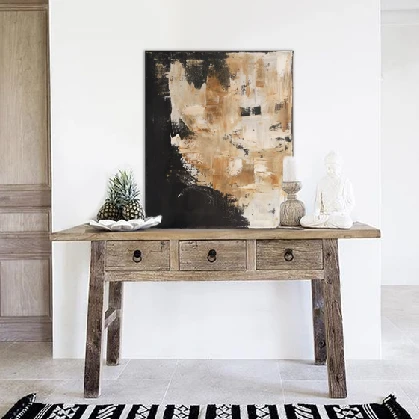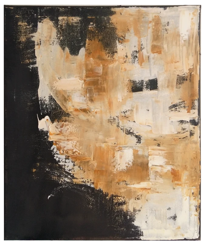 Esta pieza juega con el contraste más antiguo del mundo: luz y sombra. El negro profundo abraza los bordes como un marco orgánico, mientras el centro estalla en ocres cálidos, beiges luminosos y texturas que invitan a perderse en cada capa.
